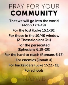 How can I pray systematically for my neighbor? If you sign up to be a light in your community (https://nafwb.org/bless) you will receive 5 neighbors daily to pray for.