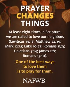 Prayer changes things. Eight times in the scripture we are called upon to love our neighbors. One of the best ways to love our neighbor is to pray for them. We are calling on all Free Will Baptists to pray regularly for their neighbors and we hope to have prayed 100,000 times by the end of the day November 4.