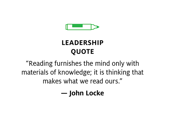 The column "Leadership Whiteboard" provides a short visual leadership coaching moment. It introduces and explains a new sketch in each issue, provides leadership coaching for further development, and shares a leadership quote and recommended book.